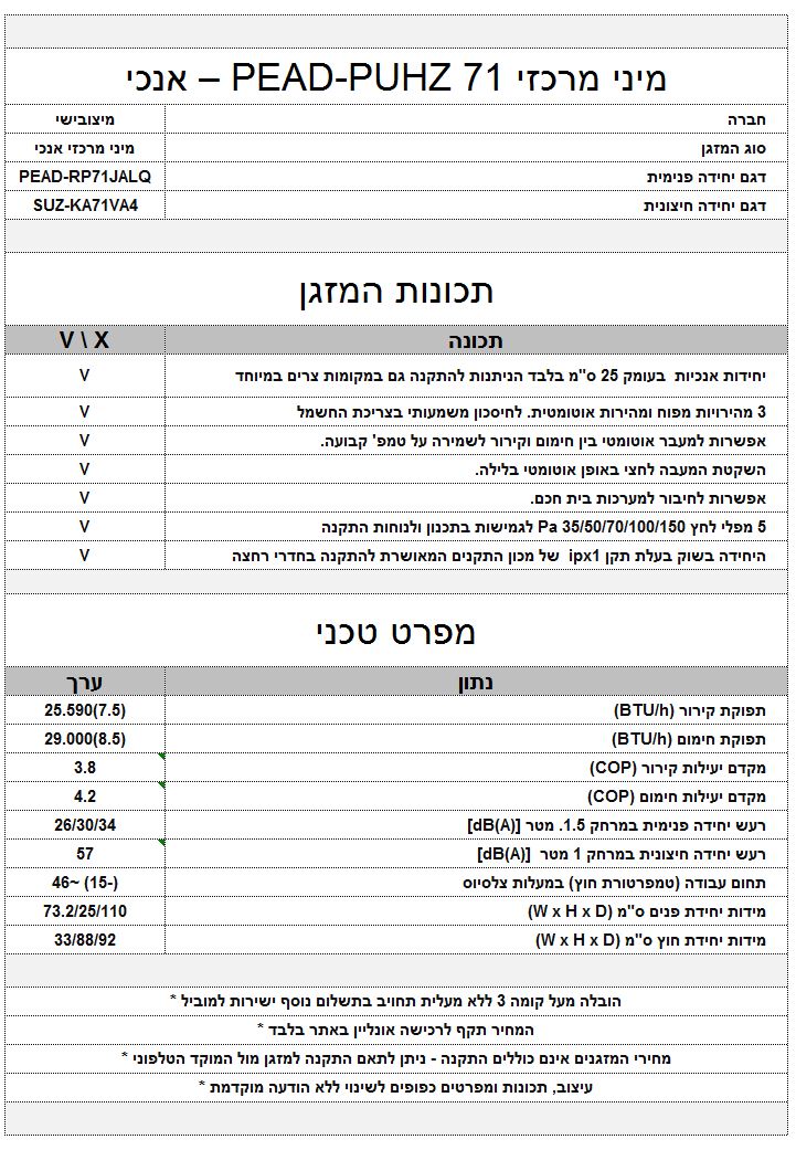 המידע אודות המזגנים הוא כללי בלבד עפ"י נתוני היצרן - אין בשמות הדגמים לאשר באופן ודאי את מפרטי המזגנים - ט.ל.ח