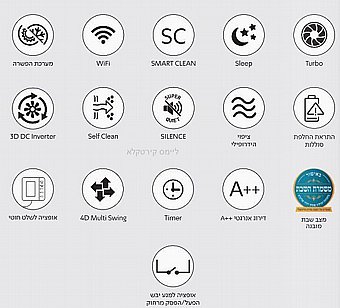 ✔ טכנולוגיית DC INVERTER ✔ תצוגת LED תאורה חכמה ✔ מקדם יעילות גבוה ✔ silent Super - כפתור Mute בשלט לפעולת מיזוג שקטה במיוחד ✔ I Feel -התאמת טמפרטורת החדר בהתאם לאזור הימצאות השלט הרחוק ✔ דירוג אנרגטי A++ ✔ מצב שינה SLEEP ✔ TURBO+ 7 מהירויות מיזוג אויר ✔ AUTO RESTART ✔ ציפוי הידרופילי ✔ פונקציית Swing Super - פיזור אוויר בארבעה כיוונים הנשלט ע"י שלט ✔ Wifi מובנה במזגן להפעלה ושליטה מרחוק דרך אפליקציה ✔שלט חכם ומואר-